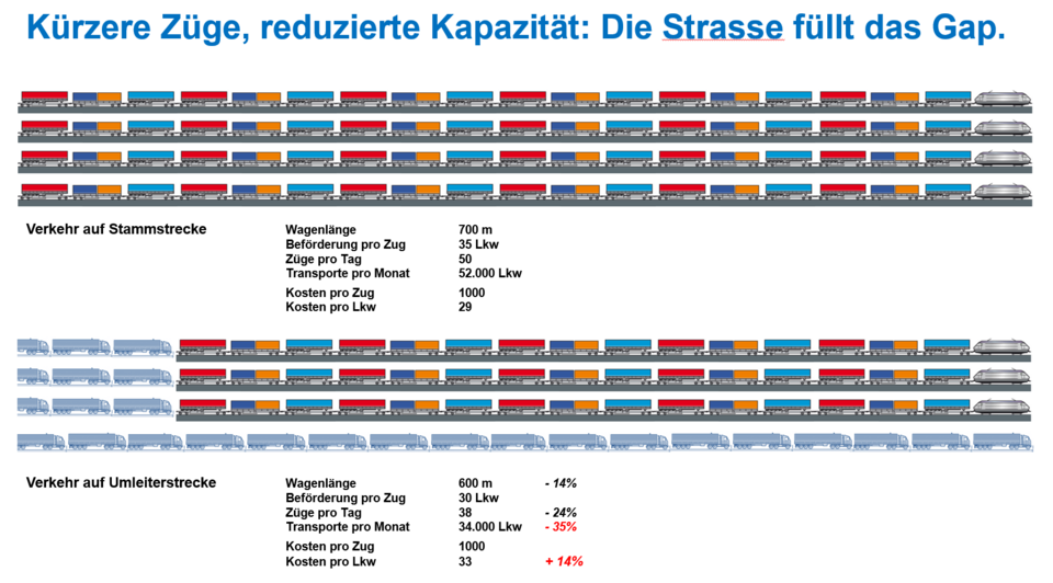 Weniger Zuglänge und weniger Trassen bedeuten konkret: gewaltige Kapazitätslücken – die sofort die Straße füllt.