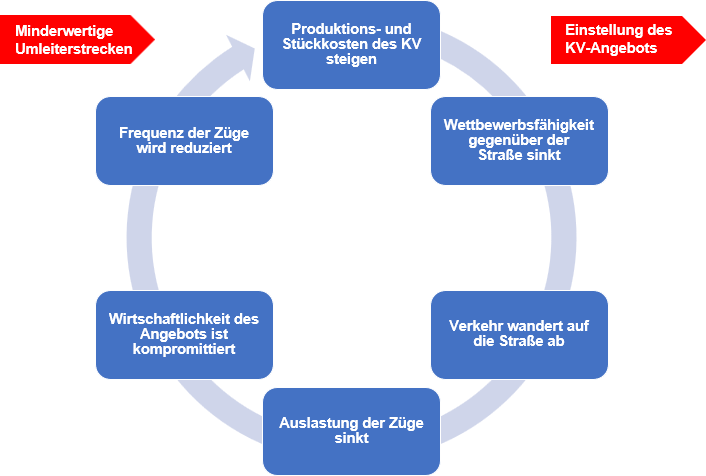 Bereits heute investieren Transportunternehmen vermehrt in zusätzliche Ressourcen für den Straßenverkehr – als notwendige Maßnahme, um weiterhin termingerecht liefern zu können. Damit setzt sich ein gefährlicher Mechanismus in Gang: Die Auslastung und damit die Wirtschaftlichkeit des KV-Angebots sinken, Zugfrequenzen müssen reduziert werden, die Attraktivität nimmt weiter ab – und im Extremfall wird eine Verbindung eingestellt.
